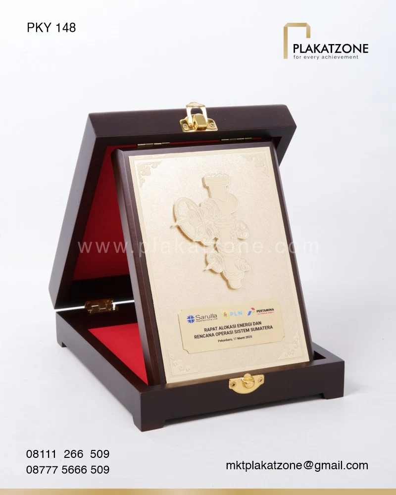 Untuk mengenang momen bersejarah ini, dibuat plakat kayu eksklusif dengan desain elegan dan detail ukiran artistik berpadu warna premium. Hasilnya, tercipta simbol apresiasi yang berkelas dan bermakna bagi acara resmi tersebut.